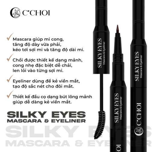 Gel chuốt mi & kẻ mắt tự nhiên C’Choi Silky Eyes – Mascara & Eyeliner được tích hợp 2 tính năng trong 1 sản phẩm. Với thiết kế 2 đầu, 1 đầu là mascara giúp kéo dài sợi mi, tăng độ dày và tạo cong tự nhiên, đồng thời chất mascara nhanh khô, chống lem. Thiết kế chổi mảnh, có độ cong nhẹ dễ chải giúp mascara bám đều và làm tơi sợi mi tạo đôi mắt đẹp tự nhiên.