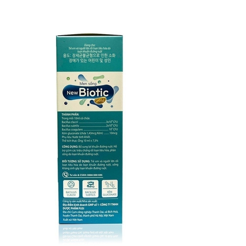 Hiệu quả nhanh Men sống New Biotic Gold được điều chế ở dạng hỗn dịch (Chứa 5 tỷ bào tử lợi khuẩn) đây là trạng thái dẫn truyền tốt nhất, lợi khuẩn phủ đều bề mặt ruột. Do đó, sẽ nhiều lợi khuẩn hơn đến được bề mặt của ruột, bám vào các “giá thể” là lớp lông nhung trên bề mặt ruột, tạo nên hiệu quả rõ ràng cho sản phẩm, giúp giảm nhanh cơn đau do tình trạng rối loạn tiêu hóa do loạn khuẩn đường ruột, và các bệnh nhân bị viêm đại tràng.An toàn khi sử dụng Thành phần tự nhiên bao gồm bào tử lợi khuẩn Bacillus Subtilis, Bacillus Clausii – Bacilus Coagulans kết hợp với Zinc Gluconate và 10ml nước cất, hoàn toàn không chứa tá dược và phụ gia nên rất thân thiện với đường ruột, không gây tác dụng phụ, có thể sử dụng cho phụ nữ mang thai và đang cho con bú. Thành phần lợi khuẩn trong sản phẩm đã được chứng minh AN TOÀN bởi Viện kiểm nghiệm Thuốc Trung ương. Tiện dụng Men sống New Biotic Gold được chia thành dạng ống nhỏ gọn, dễ dàng mang theo trong túi khi đi ăn uống, du lịch, giúp hệ tiêu hóa và đại tràng ổn định, không lo đau bụng đột xuất.